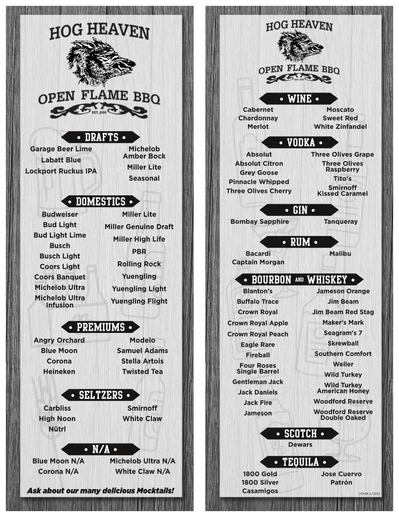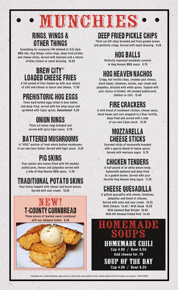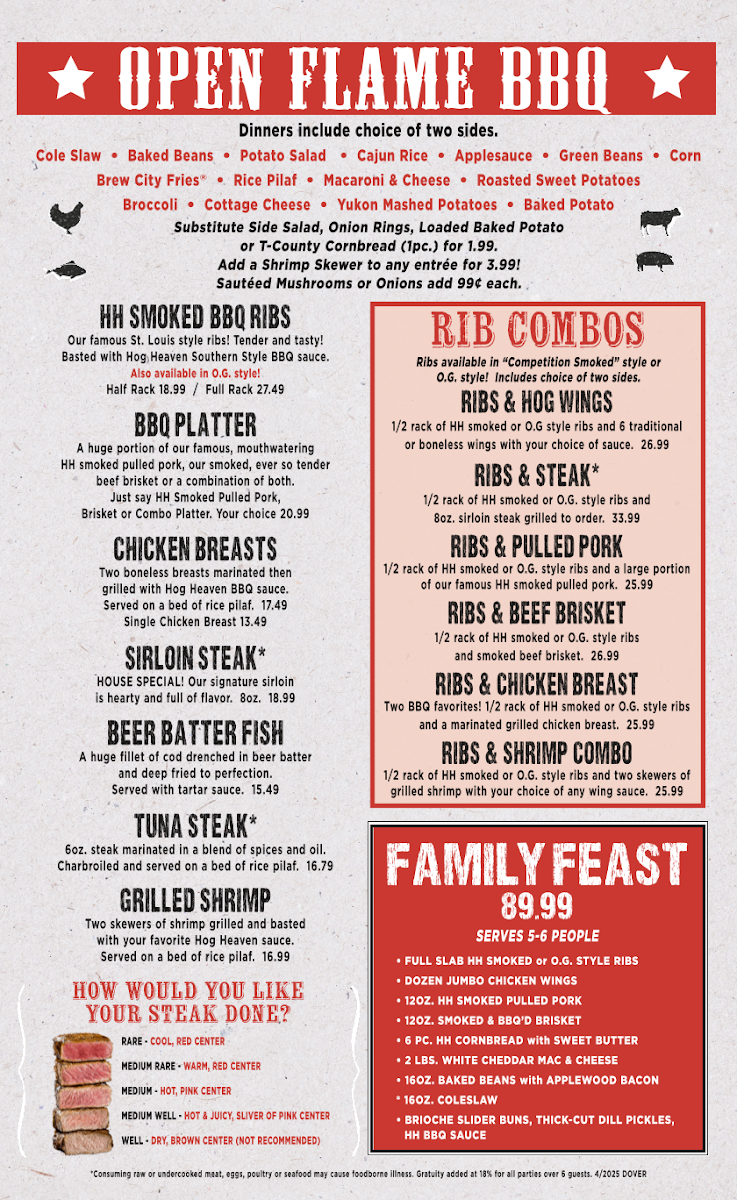 Something for everyone! HH smoked or O.G style BBQ ribs, Hog Wings, onion rings, deep fried pickles and cheese sticks, served with marinara and a choice of bleu cheese or ranch dressing.