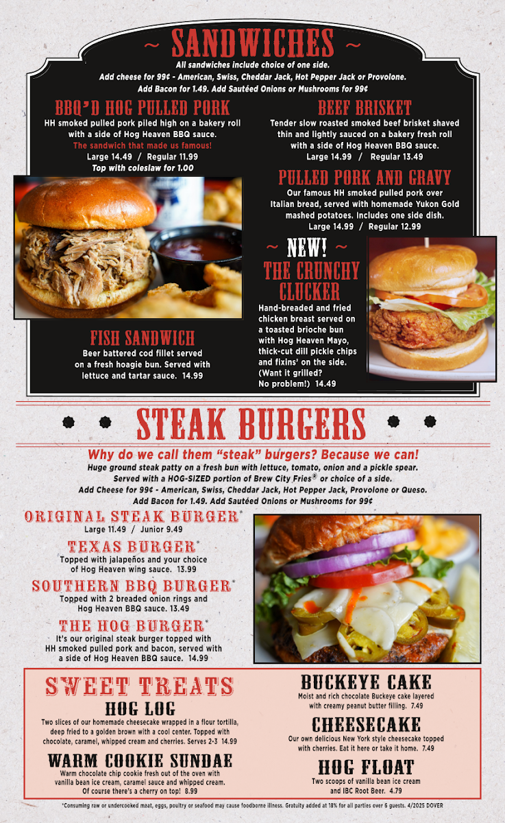 Huge ground steak patty on a fresh bun with lettuce, tomato, onion and a pickle spear. Served with a HOG-SIZED portion of Brew City Fries or choice of a side.